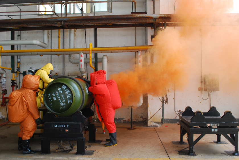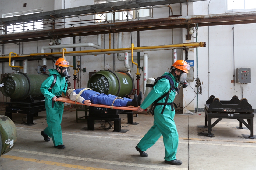 为进一步提高员工安全事故处置能力,减少事故的各种损失,4月27日,公司组织液氯包装岗位氯气泄漏事故应急演练,模拟正在充装的一只液氯钢瓶因腐蚀穿孔,造成有毒气体泄漏,现场一名操作人员中毒昏迷的紧急事故。